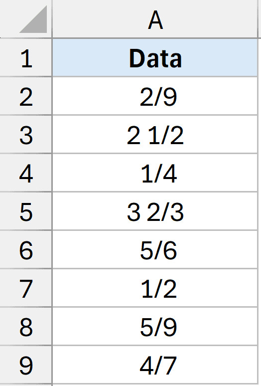 Tập dữ liệu hiển thị phân số trong Excel cần chuyển đổi
