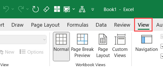 Nhấp vào thẻ View trên thanh công cụ Ribbon của Excel -