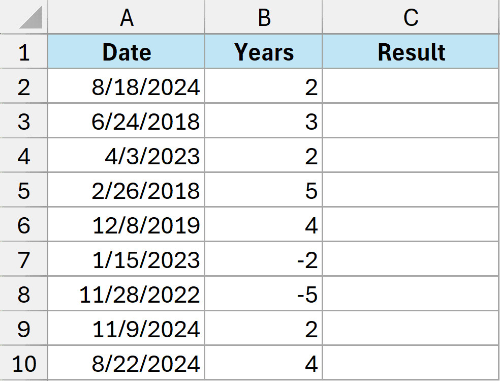 Dữ liệu mẫu để cộng năm vào ngày trong Excel với các cột ngày gốc và số năm