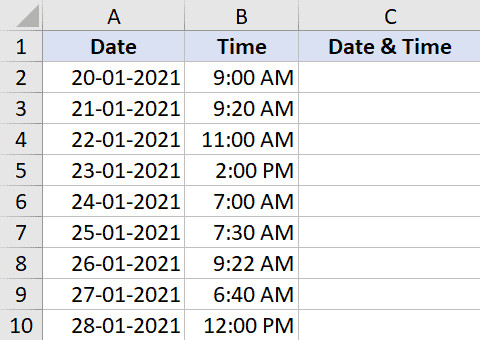 Dữ liệu ngày và giờ nằm ở hai cột riêng biệt trong Excel