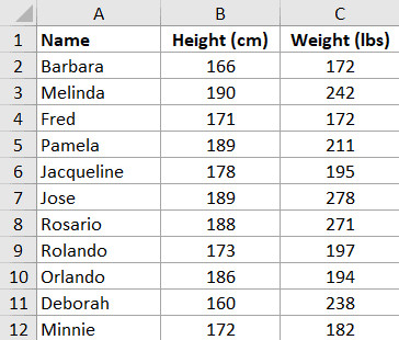Giả sử bạn có một tập dữ liệu gồm 10 người, với hai thông số là Chiều cao (Cột B) và Cân nặng (Cột C). Bạn muốn xác định xem liệu người cao hơn có xu hướng nặng hơn không.