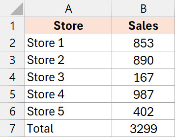 Phương pháp phổ biến nhất để áp dụng gạch chân là tác động lên toàn bộ nội dung của ô. Dưới đây là ví dụ với một tập dữ liệu bao gồm tên nhân viên ở cột A, doanh số ở cột B và tổng doanh số ở ô B7.