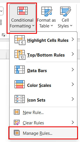 2. Truy cập trình quản lý: Tại thẻ Home, chọn Conditional Formatting > Manage Rules.